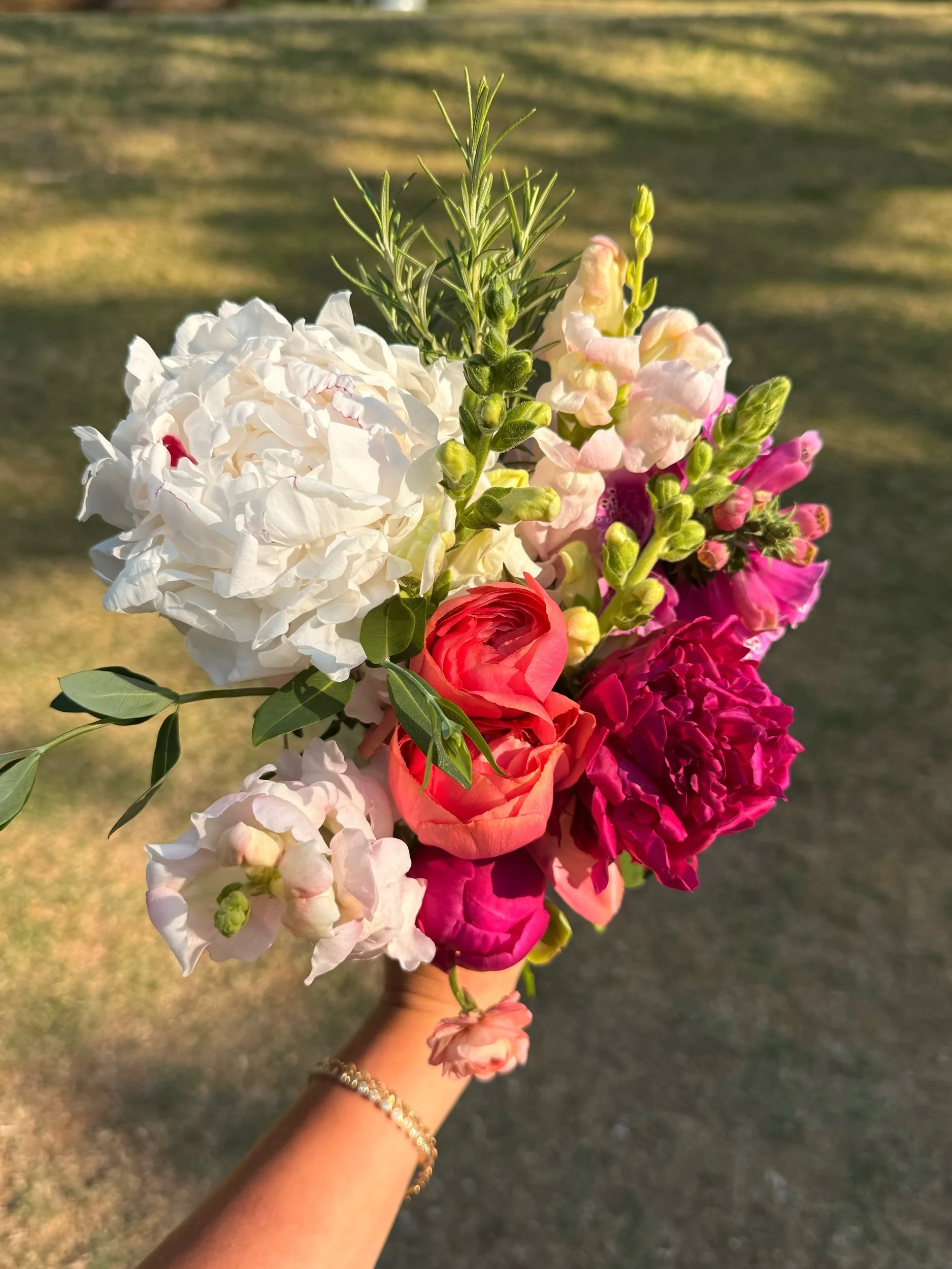 A stunning arrangement featuring peonies, snapdragons, and greenery!