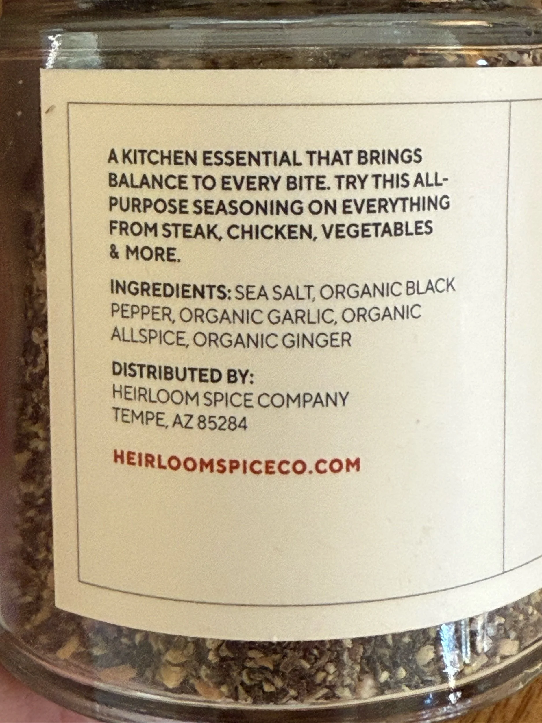 Ingredients: sea salt, organic black pepper, organic garlic, organic allspice, organic ginger